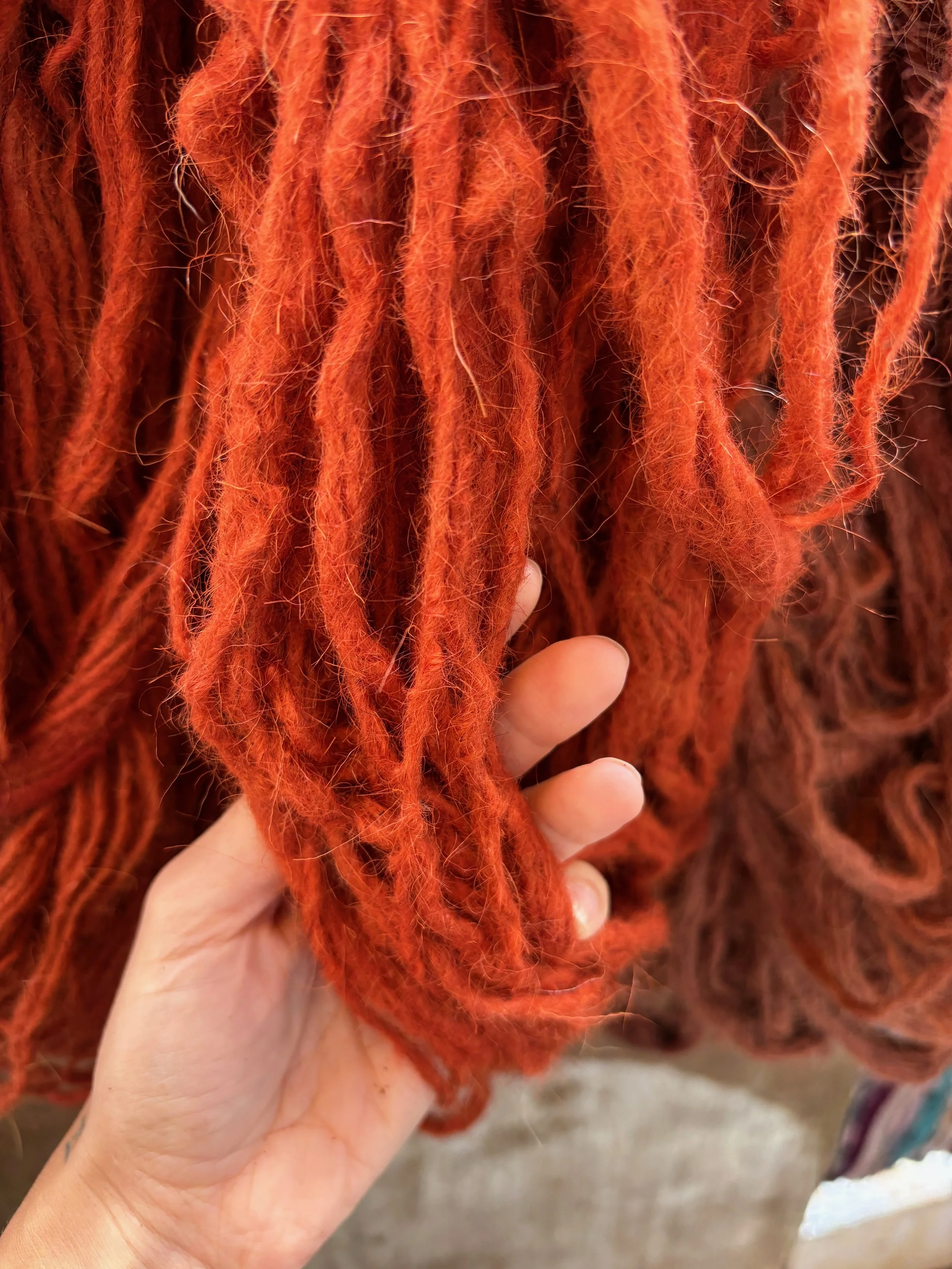 Madder dyed wool runs down the middle of THREE SUNS tapestry