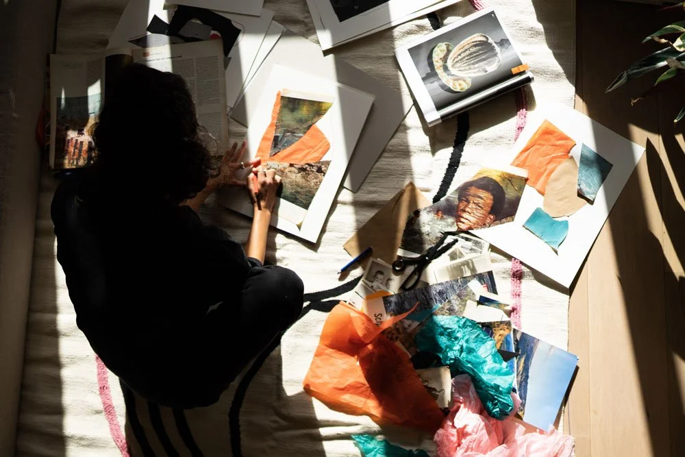Custom-framed original collages created by Salma Barakat are usually exhibited alongside the rugs to show design transition. Signed, limited edition art prints on Hahnemühle Fine Art paper are also presented in different sizes with custom spacing.